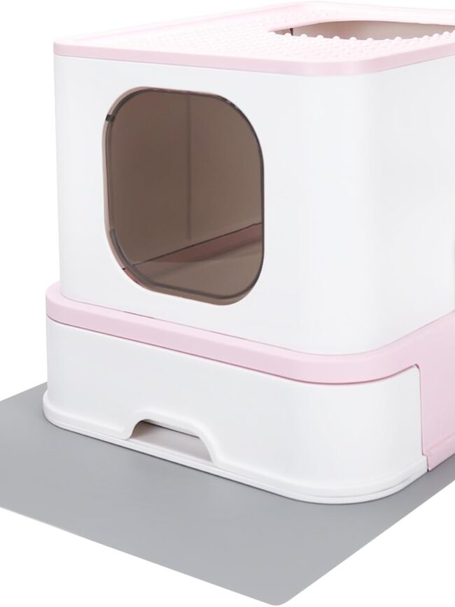 Easy to Clean: The litter tray with upgraded removable drawer design and scoop 2-in-1 litter included make cleaning litter much easier. Easy to clean up feline mess with minimal mess. The mat is easy to clean with a non-slip backing, also suitable for placing under feeding bowls to catch spills.