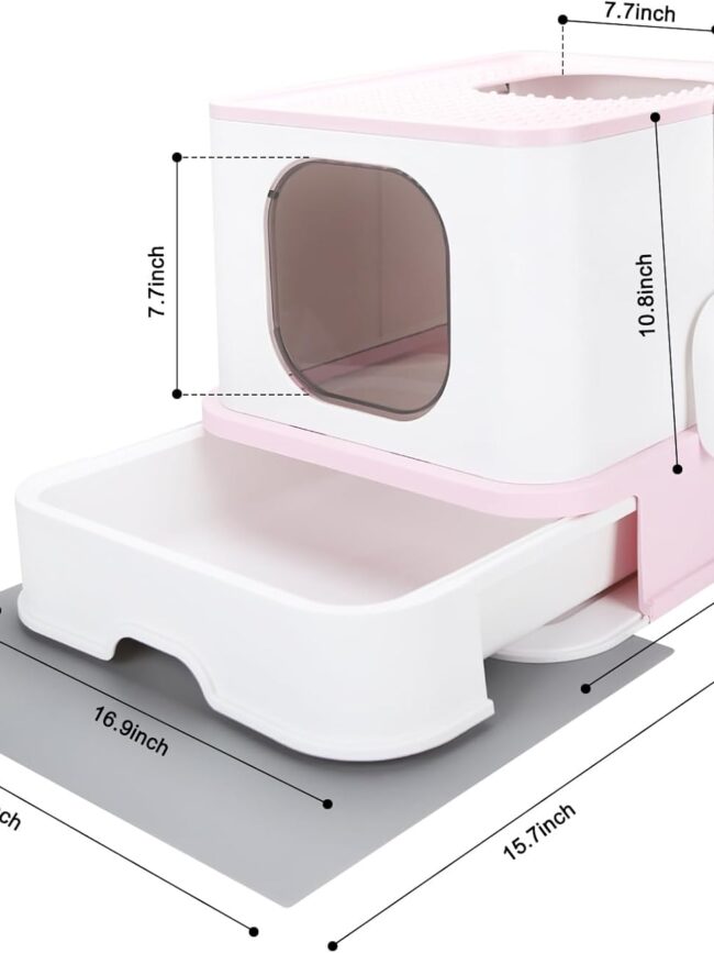 Easy to clean: the litter tray with Improved pull-out drawer design and the included 2-in-1 litter scoop make cleaning litter much easier. Easy to clean up feline mess with minimal mess. The mat is easy to clean with a non-slip backing, also suitable for placing under feeding bowls to catch spills.
