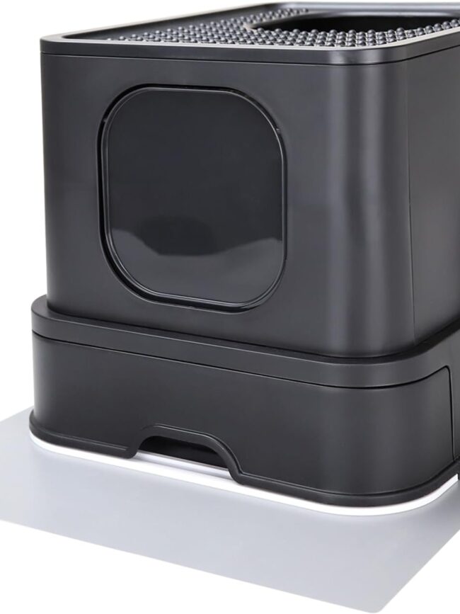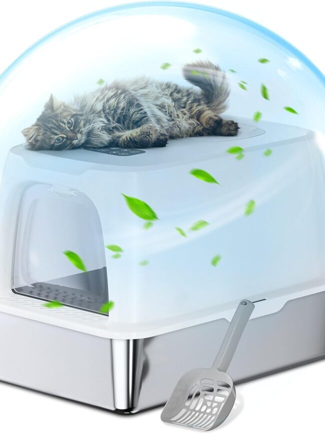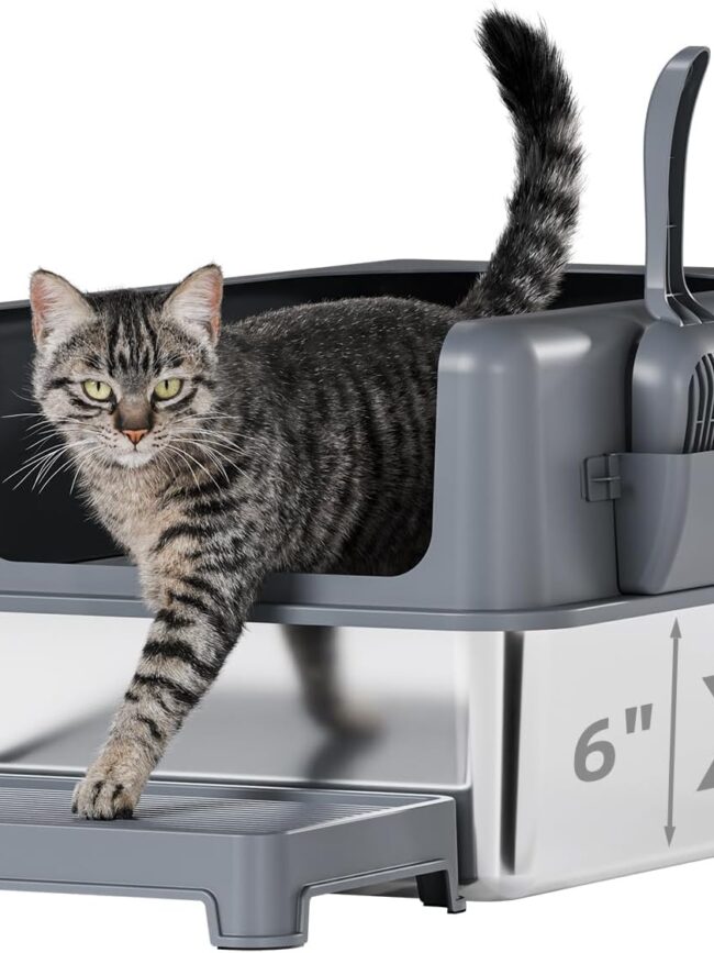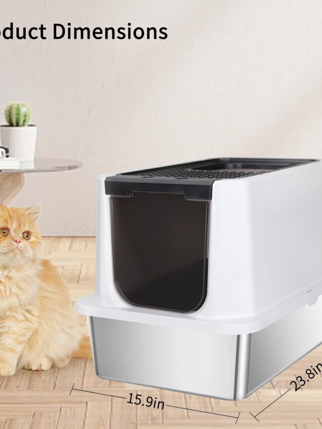 【Easy to clean】: The non-stick surface of the litter box with lid makes it Cleanup is a piece of cake as debris slides off effortlessly with a quick rinse of water. Unlike plastic litter box, the stainless steel box does not absorb stains or odors, maintaining a fresh and hygienic environment for your cat.