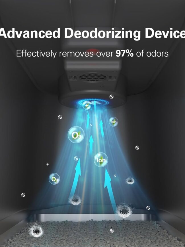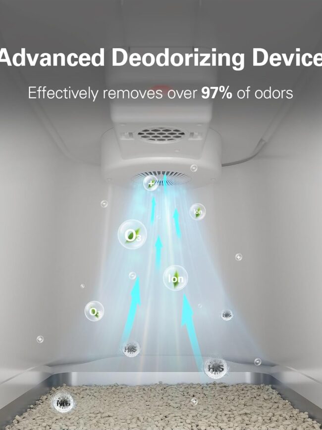 Eliminates 99% of odor - The large litter box has a built-in smart chip that generates electroionic odor decomposition, combined with a unique internal circulation system that constantly decomposes and eliminates odors inside the cat litter box. Just plug in and enjoy the odor-free environment created by the smart cat litter box. NOTE: The cat litter box does not require any deodorizer to be replaced, which will reduce your deodorization costs