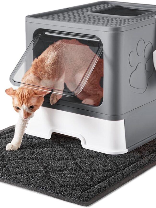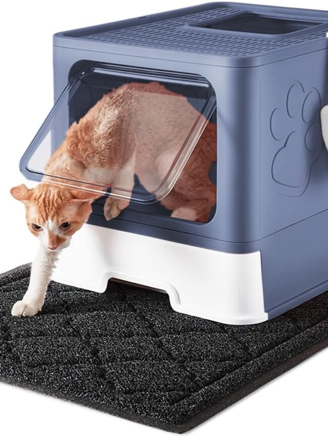 Environmentally friendly product: The cat litter box with lid is made of stain resistant plastic. It can be folded flexibly and easy to clean, providing a clean living environment for your cat. The extra large sand mat is made of high quality safe PVC material that is BPA and phthalate free.
