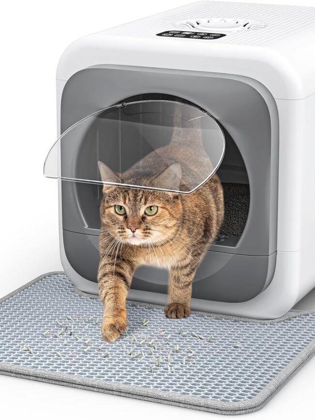 【Prevent cats from being startled】: Our extra-large litter box has a sensor infrared that stops operation when the cat enters, avoiding shocks while using the bathroom. The unique pedal and litter mat effectively track litter after use, maintaining cleanliness around the litter box enclosure.