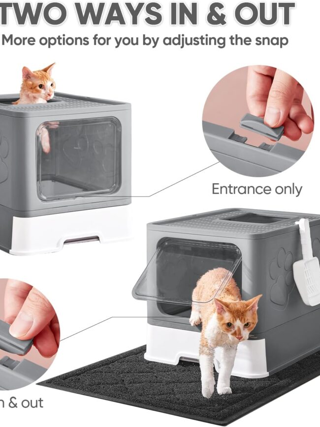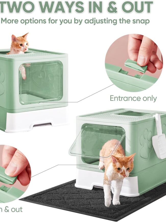 Two ways to enter and exit : By adjusting the snap, you can control the door can only enter or release. Self-closing front entry leaves odor and dirt inside. The top litter pedal prevents cat litter from being sprayed everywhere. The closed structure ensures the privacy of the pet cat.
