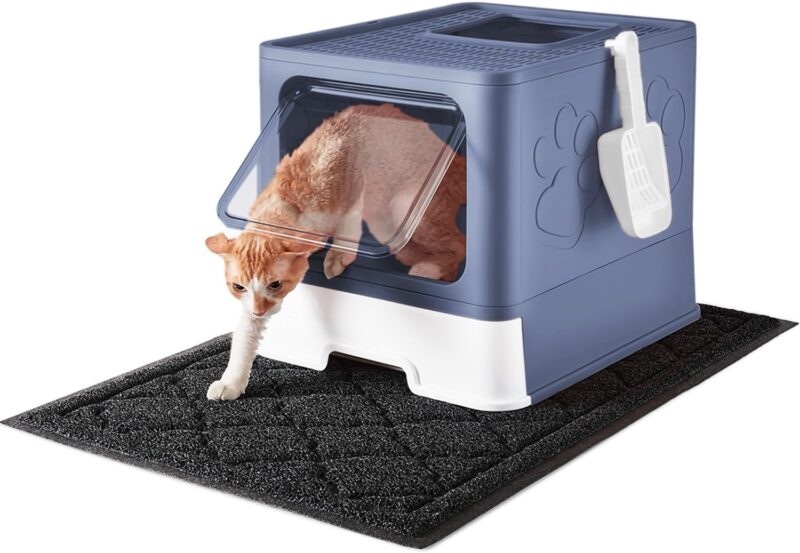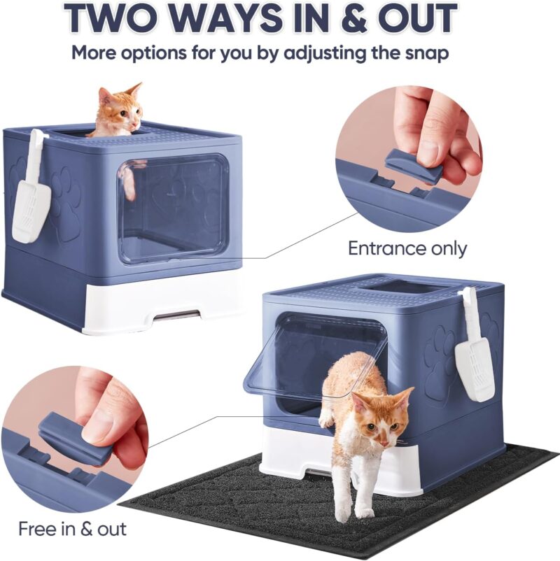 Cat Litter Box with Extra Large Cat Litter Mat and Scoop, Large Foldable Litter Box with Lid, Top Front Entry, Kitten Outlet, Odor Control,