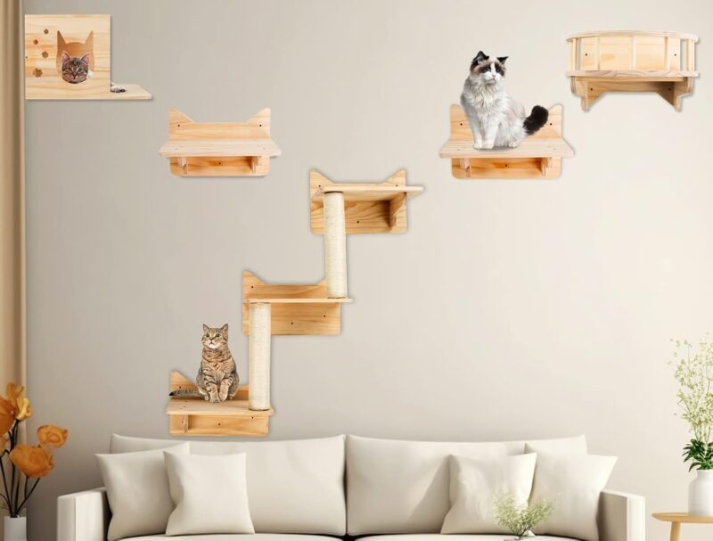 • 📢MULTIFUNCTIONAL: Our cat wall furniture is not just for climbing and perching. They can also serve as a scratching post, a play area, and a hiding spot for your cat. The furniture includes shelves, perches, stairs, and a Condos House to provide your cat with different levels of activity and comfort. The scratching posts are made of sisal rope, which is durable and safe for your cat to scratch.
