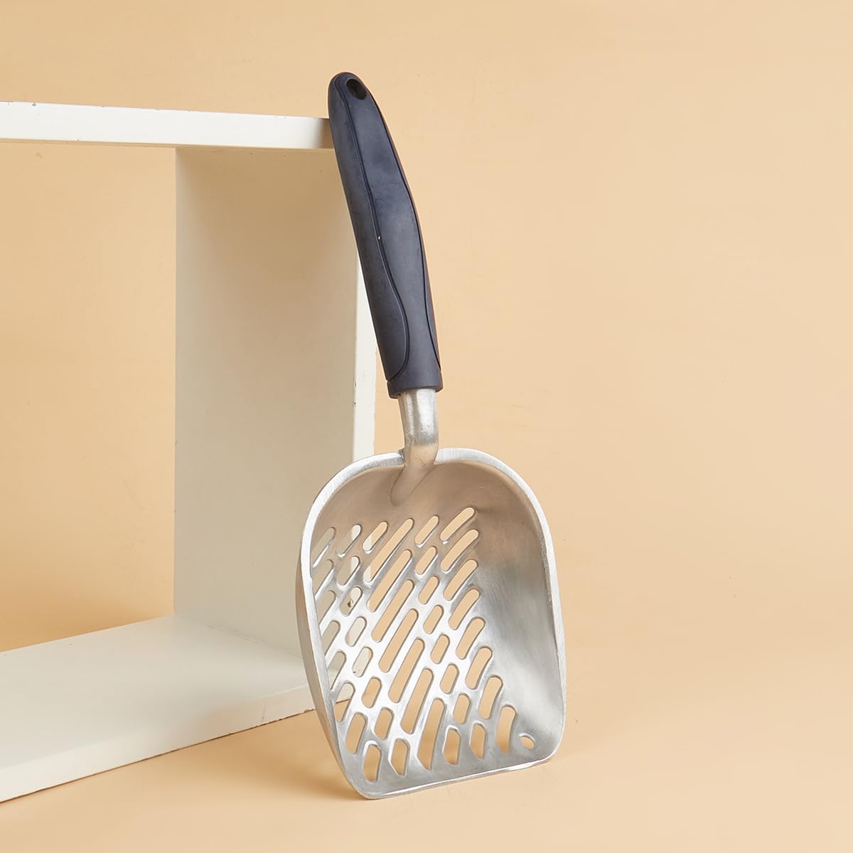 • The litter scooper comes with LONGER and durable metal joint, it avoids the breaking or bending of rubber grip. Ergo rubber handle helps you feel comfortable and easier to scoop cat poop. Our litter scoop owns 4 non-slip tabs preventing fall-off of handle.