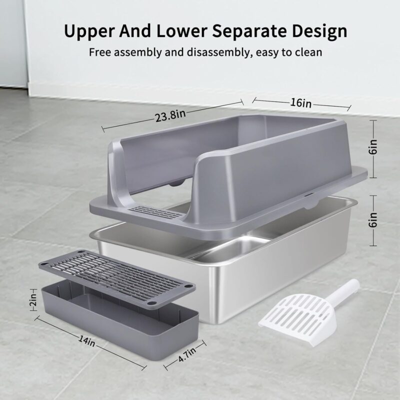 • Stainless steel litter box: The litter box is made of stainless steel, which It is stronger and more durable than plastic litter boxes and will not rust, sand will slide off the smooth surface without leaving scratches, making it suitable for long-term use. Stainless steel litter boxes are also odorless, creating a safer, cleaner environment for your cat.
